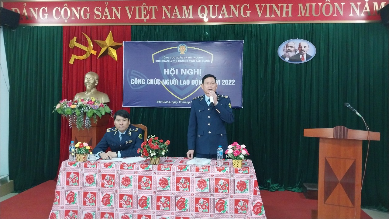 Trong cùng ngày 11/01, Cục QLTT tỉnh Bắc Giang tổ chức Hội nghị công chức, người lao động năm 2022. Đồng chủ trì Hội nghị có đồng chí Chu Thanh Hiến - Phó Cục trưởng phụ trách và đồng chí Tạ Văn Đức - Phó Cục trưởng, Chủ tịch Công đoàn cơ quan.