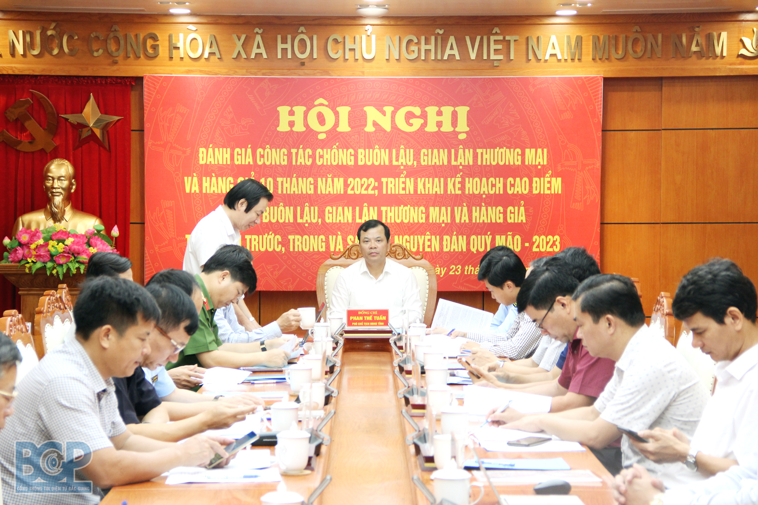 Sáng 23/11, Ban Chỉ đạo (BCĐ) 389 tỉnh Bắc Giang tổ chức hội nghị sơ kết công tác chống buôn lậu, gian lận thương mại và hàng giả 10 tháng năm 2022; triển khai Kế hoạch cao điểm chống buôn lậu, gian lận thương mại và hàng giả thời gian trước, trong và sau Tết Nguyên đán Quý Mão - 2023. Đồng chí Phan Thế Tuấn - Phó Chủ tịch UBND tỉnh, Trưởng BCĐ 389 tỉnh chủ trì hội nghị.